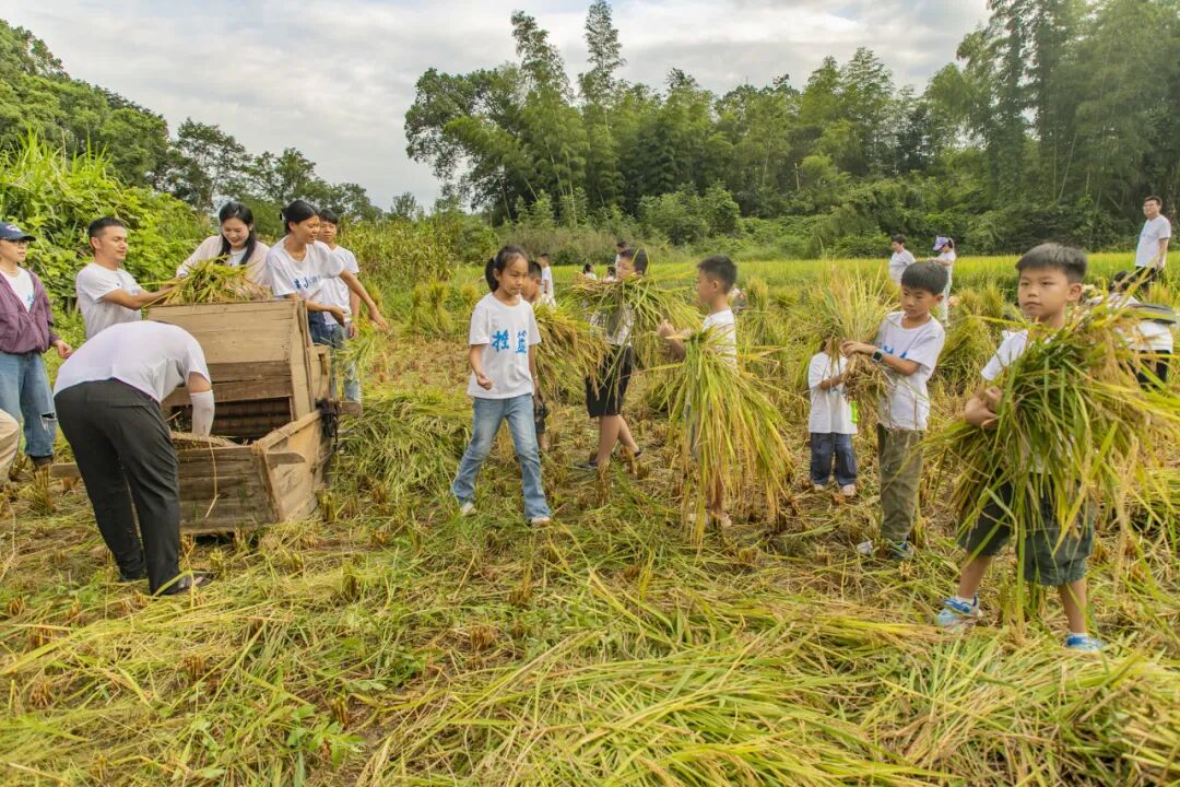 開鐮了!在家長的帶領(lǐng)下,《搖籃》寶寶們有的揮動鐮刀割稻子,有的給在打谷機邊忙碌的家長運送稻子,有的埋頭撿拾散落在田間的稻穗,有的扎草垛和稻草人,稻田里到處是忙碌快樂的小身影。經(jīng)過一個下午的緊張勞動,秋收任務(wù)終于完成。