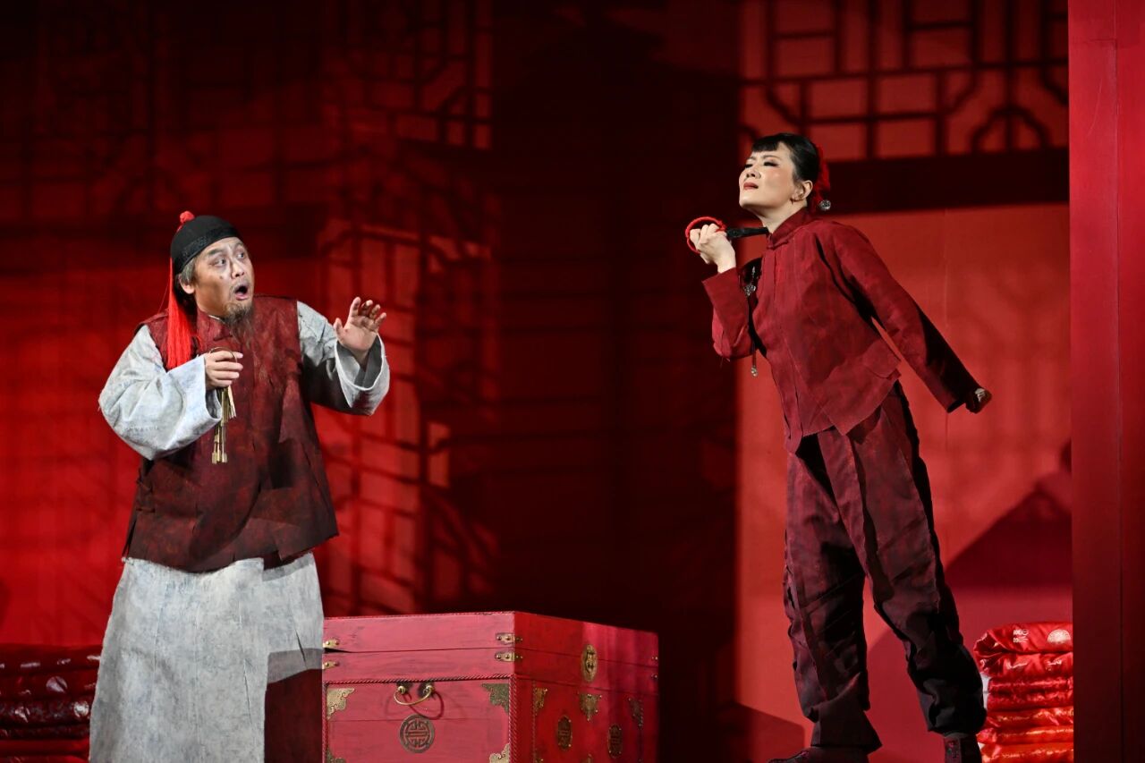 小說的線性敘事難以展現(xiàn)視覺與音樂切換所產(chǎn)生的巨大張力,而這正是歌劇藝術(shù)的魅力所在。在第二場(chǎng)中,一座精雕細(xì)琢的中式婚床成為舞臺(tái)核心,九兒身披紅嫁衣,靜坐于血色光影中,周遭的紅燈籠、錦緞鋪蓋,共同構(gòu)筑起一個(gè)華麗而壓抑的封建牢籠。當(dāng)患有肺癆的單扁郎踉蹌闖入,在婚床上展開一場(chǎng)追逐時(shí),戲劇的荒誕感油然而生。他唱腔滑稽,強(qiáng)調(diào)“姻緣天定”;九兒的回?fù)魟t如驚雷,唱出“寧死不嫁漢奸”的決絕。二人風(fēng)格迥異的唱段形成尖銳對(duì)抗:?jiǎn)伪饫傻某粠е邓椎慕器?,九兒的反擊則如山崩地裂。于是,婚床化身“戲臺(tái)”,上演著一場(chǎng)被圍觀的儀式。這種“臺(tái)中臺(tái)”的嵌套設(shè)計(jì),極大地濃縮了沖突,讓個(gè)體的反抗在與環(huán)境、命運(yùn)的對(duì)抗中,迸發(fā)出悲劇性的崇高感。更加震撼人心的,是緊隨其后的場(chǎng)景切換:舞臺(tái)從壓抑可怖的婚床轉(zhuǎn)變?yōu)闊o邊的高粱地。余占鰲與九兒在此深情重唱,那簡(jiǎn)單的問答“這里就是家”,與先前場(chǎng)面形成天壤之別。情感如野火般掙脫所有束縛,使這片高粱地化作一場(chǎng)對(duì)生命、自由與愛最直接、最熱烈的禮贊。