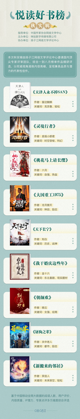 “悅讀好書榜”由中國作家協(xié)會網(wǎng)絡文學中心指導,咪咕數(shù)字傳媒有限公司主辦、揚子江網(wǎng)絡文學評論中心協(xié)辦,按月發(fā)布。上榜作品均基于咪咕閱讀的中國移動大數(shù)據(jù)篩選推薦及權(quán)威評論家遴選。截止目前,上榜圖書在全網(wǎng)累計收獲上億曝光,總計入選的64部作品中,16本已進入影視化改編階段,23本改編為有聲書,12本已出版或進入出版階段。眾多榜單作品在較短的上線周期內(nèi),迅速積累起高人氣,并受到影視行業(yè)的密切關(guān)注。