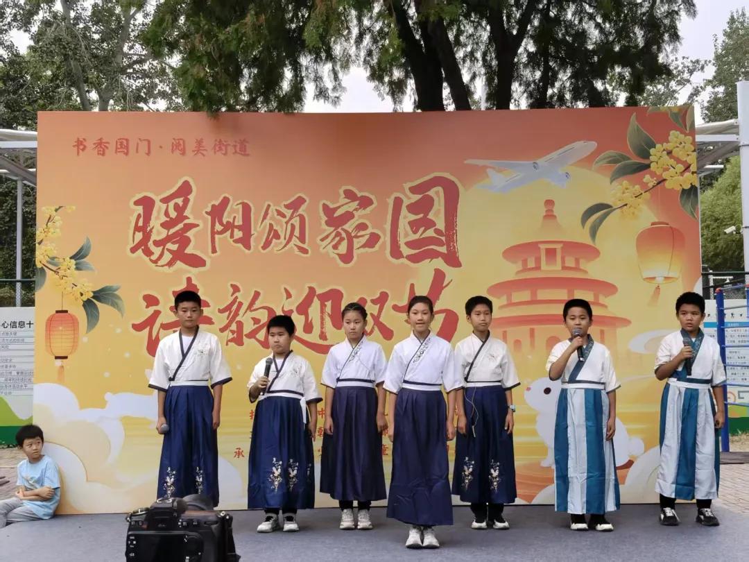 詩會環(huán)節(jié)作為整場活動的核心亮點(diǎn),將氛圍推向高潮。首都機(jī)場街道童聲詩歌朗誦團(tuán)與九十四中學(xué)的孩子們身著統(tǒng)一服裝,以清澈純凈的童聲深情朗誦《弟子規(guī)》、《詩詞里的中國》、《黃河頌》等經(jīng)典詩作,稚嫩的嗓音中飽含對祖國的祝福與對傳統(tǒng)文化的熱愛,打動了現(xiàn)場每一位觀眾。