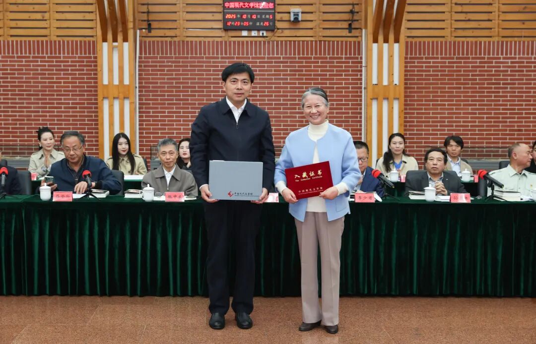 鄭蘇伊代表臧克家親屬向中國現(xiàn)代文學(xué)館捐贈了1000余件手稿、實(shí)物,368本名家簽名贈書等珍貴文獻(xiàn)。中國現(xiàn)代文學(xué)館常務(wù)副館長王軍接受捐贈,并頒發(fā)入藏證書