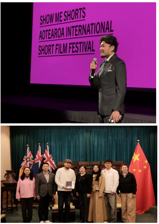 10月7日,在第20屆新西蘭秀美國際短片電影節(jié)上,中國首次擔任榮譽主賓國?!掇D(zhuǎn)人工》作為開幕夜首映電影在奧克蘭一座有著140多年歷史的古典劇場The Civic正式放映。來自不同國家的700多位觀眾匯聚一堂,在不斷的歡笑聲中欣賞了這部充滿文學意味的“有趣的電影”。奧克蘭中國文化中心負責人王建文在致辭中表示:“短片藝術(shù)是影像語言中最具張力與實驗精神的形式。希望通過這樣的國際平臺,讓世界更好地了解當代中國青年人的思考與表達,也促進中新兩國的文化互鑒與情感共鳴?!痹谟澈蠼涣髦校粩嘤袩嵝挠^眾圍著劉漢霖,表達對這部電影反映的社會問題的認同感,期待讀到更多他的文學作品。