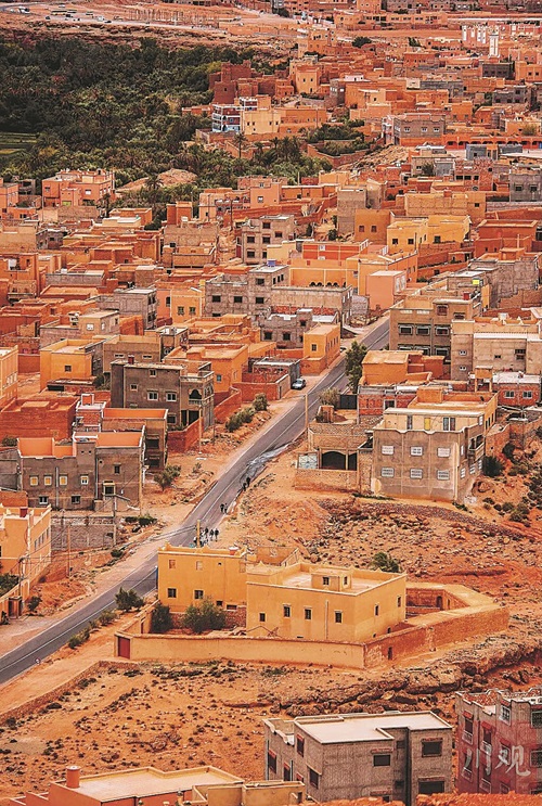 不止《卡薩布蘭卡》,很多電影都是在摩洛哥取景。前往沙漠途中經(jīng)過的阿伊特本哈杜筑壘村和瓦爾扎扎特堪稱是摩洛哥的橫店。阿伊特本哈杜筑壘村于1987年被評為世界遺產(chǎn),《阿拉伯的勞倫斯》《角斗士》《權(quán)力的游戲》等影視作品都曾在此拍攝。瓦爾扎扎特還有供游客參觀的電影城。當(dāng)然,更吸引我的還是本地人的市井生活。在瓦爾扎扎特的酒店放好行李后,我走到城鎮(zhèn)中心閑逛,廣場中心圍了一圈看表演的當(dāng)?shù)厝恕=值啦凰銓掗?,兩邊支起了攤位,賣甘蔗汁、烤棉花糖、炸爆米花,像極了國內(nèi)縣城的春節(jié)景象。沒能在國內(nèi)過年,竟然在異國他鄉(xiāng)收獲了相似的體驗。我買了一杯牛油果奶昔,伴著粉色的晚霞在天黑前回到酒店。