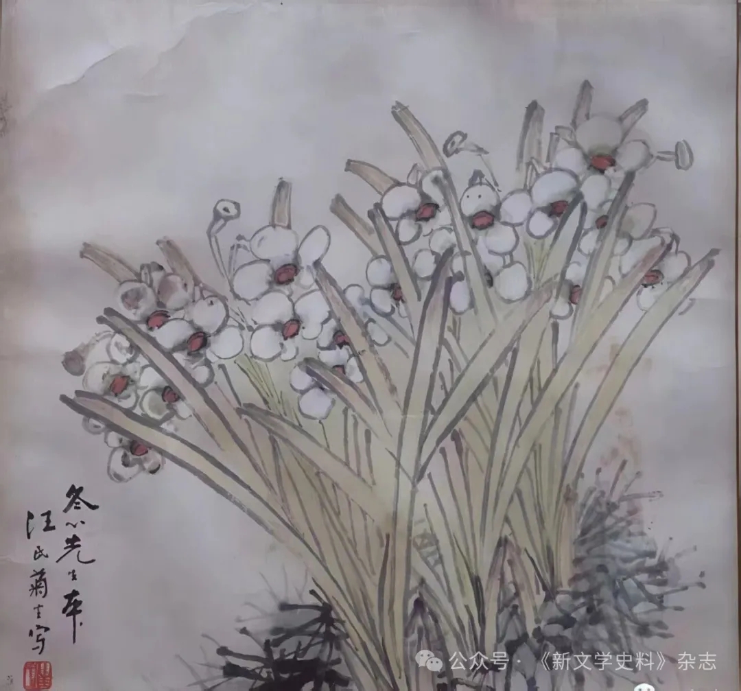 汪曾祺父親汪菊生是位眼科醫(yī)生,家鄉(xiāng)流傳著他許多醫(yī)者仁心的故事,且多才多藝,亦是一位畫(huà)家,我于偶然中得到一幅他畫(huà)的“水仙圖”。