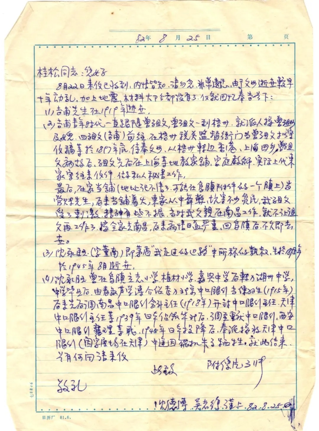 但是,比較遺憾的是,我在二十世紀(jì)八十年代與沈德溥、吳志復(fù)老師通信聯(lián)系多年,他們也給過我不少信,卻因?yàn)楫?dāng)年我沒有見到茅盾給阿英先生的這些信,請(qǐng)教起來常常不得要領(lǐng),只是一些日常的問候,只知道吳志復(fù)后來是從事會(huì)計(jì)財(cái)務(wù)工作,沈德溥先生是從事經(jīng)濟(jì)工作?,F(xiàn)在看到了茅盾致阿英先生的信,而沈德溥、吳志復(fù)這兩位茅盾的堂弟、堂弟媳已經(jīng)離開我們多年,再也無法了解當(dāng)年更多的細(xì)節(jié)了。不過,僅僅從這茅盾的兩封信,也可以看到其可貴的人格魅力。他不忘為國(guó)家銀行事業(yè)獻(xiàn)身的凱叔,為其后人的就業(yè)操心,這看似是私事,其實(shí)是讓因公犧牲的銀行家凱叔在天之靈得到安慰的公事。
