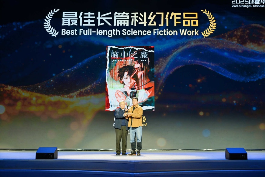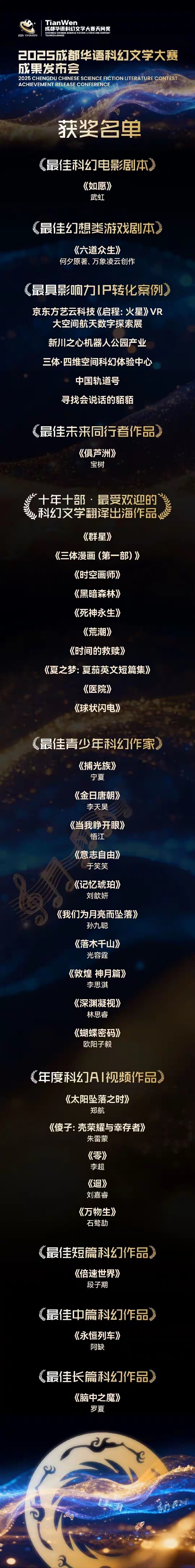 發(fā)布會(huì)上,頒發(fā)了十個(gè)單元類別的獎(jiǎng)項(xiàng),武虹《如愿》獲最佳科幻電影劇本獎(jiǎng); 何夕原著、萬(wàn)象凌云創(chuàng)作的《六道眾生》獲最佳幻想類游戲劇本獎(jiǎng);京東方藝云科技的《啟程:火星》VR大空間航天數(shù)字探索展獲最具影響力IP轉(zhuǎn)化案例;寶樹(shù)《俱蘆洲》獲最佳未來(lái)同行者作品獎(jiǎng);《群星》《三體漫畫(huà)(第一部)》《時(shí)空畫(huà)師》《黑暗森林》《死神永生》《荒潮》《時(shí)間的救贖》《夏之夢(mèng):夏茄英文短篇集》《醫(yī)院》《球狀閃電》獲“十年十部·最受歡迎的科幻文學(xué)翻譯出海作品”獎(jiǎng);寧夏、李天昊、悟江、于笑笑、劉歆妍、孫九聰、光容霆、李思淇、林思睿、歐陽(yáng)子毅獲最佳青少年科幻作家獎(jiǎng);《太陽(yáng)墜落之時(shí)》《傻子:殼榮耀與幸存者》《零》《迴》《萬(wàn)物生》獲年度科幻AI視頻作品獎(jiǎng);段子期《倍速世界》獲最佳短篇科幻作品獎(jiǎng);阿缺《永恒列車》獲最佳中篇科幻作品獎(jiǎng),羅夏《腦中之魔》獲最佳長(zhǎng)篇科幻作品獎(jiǎng)。