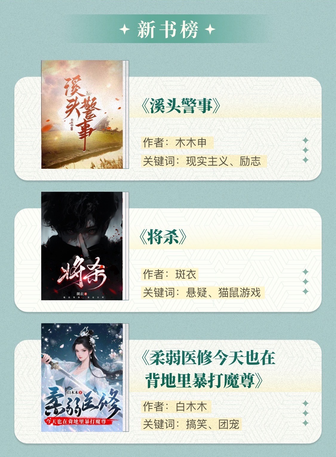在新書(shū)榜中,三部新作在類型文的基礎(chǔ)上展開(kāi)了新的突破。現(xiàn)實(shí)主義題材作品《溪頭警事》扎根當(dāng)下基層現(xiàn)實(shí),通過(guò)數(shù)字化改革的生動(dòng)實(shí)踐讓網(wǎng)絡(luò)文學(xué)成為記錄時(shí)代變革的載體,展現(xiàn)出網(wǎng)絡(luò)文學(xué)參與主流價(jià)值構(gòu)建的積極姿態(tài)。懸疑作品《將殺》在劇情爽感之外,深層次聚焦家暴、創(chuàng)傷與人性困局,使作品具備兼具類型吸引力與現(xiàn)實(shí)關(guān)懷的思想深度。女頻玄幻作品《柔弱醫(yī)修今天也在背地里暴打魔尊》則通過(guò)對(duì)人物的反套路設(shè)定與幽默的敘事風(fēng)格,在遵循修仙類型規(guī)則的基礎(chǔ)上完成創(chuàng)意重塑,為修仙類型寫作提供了可借鑒的范式。