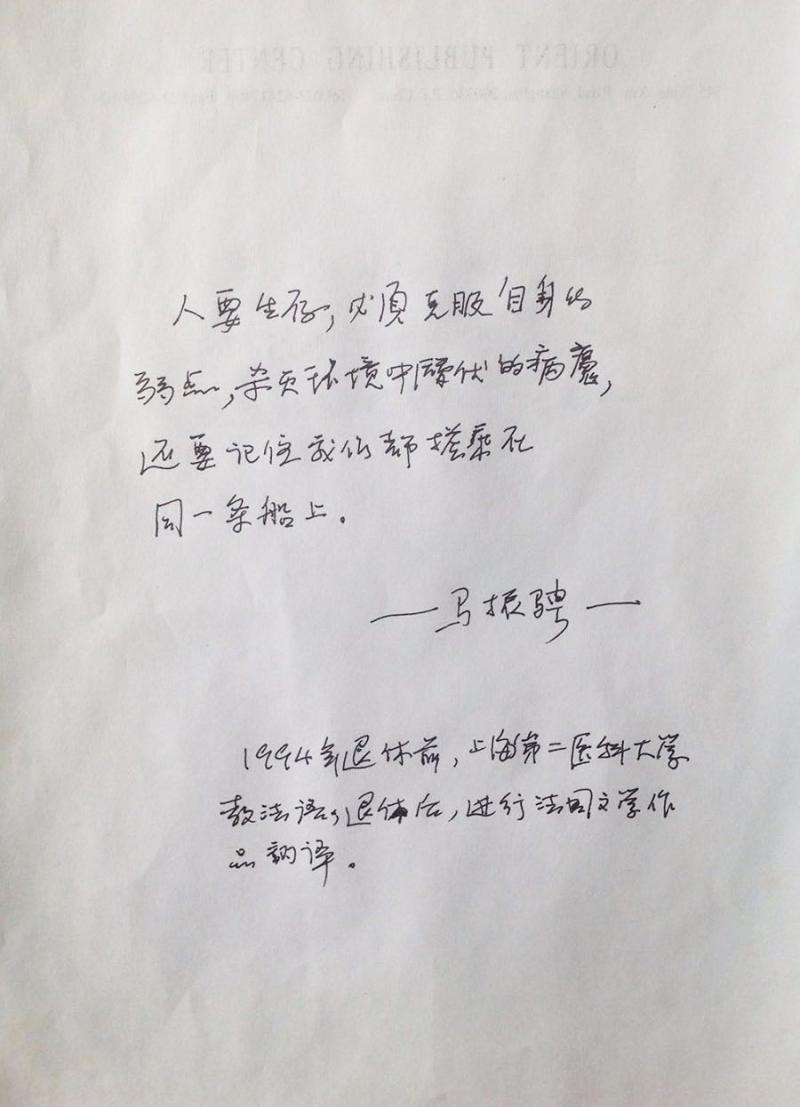 “1994年退休前,上海第二醫(yī)科大學教法語,退休后,進行法語文學作品的翻譯?!边@是法語文學翻譯家馬振騁對自己的簡樸介紹。