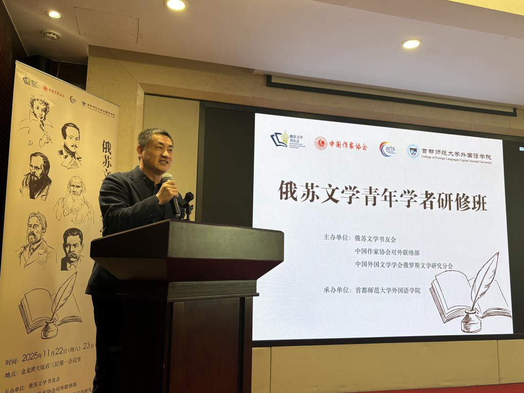 為賡續(xù)中俄文學(xué)交流傳統(tǒng),深化兩國(guó)人文合作,2025年11月22日至23日,“俄蘇文學(xué)青年學(xué)者研修班”在京成功舉行。作為“俄蘇文學(xué)書友會(huì)”的重要活動(dòng)之一,本次研修班由中國(guó)作家協(xié)會(huì)對(duì)外聯(lián)絡(luò)部、中國(guó)外國(guó)文學(xué)學(xué)會(huì)俄羅斯文學(xué)研究分會(huì)主辦,首都師范大學(xué)外國(guó)語學(xué)院承辦,旨在凝聚青年人才、提升研究水平,積極構(gòu)建俄蘇文學(xué)研究的“中國(guó)學(xué)派”?!岸硖K文學(xué)書友會(huì)”是在中宣部文藝局的指導(dǎo)下,由中國(guó)作協(xié)外聯(lián)部聯(lián)合有關(guān)部門發(fā)起的常態(tài)化、專業(yè)化、公眾化的中俄人文交流平臺(tái)。