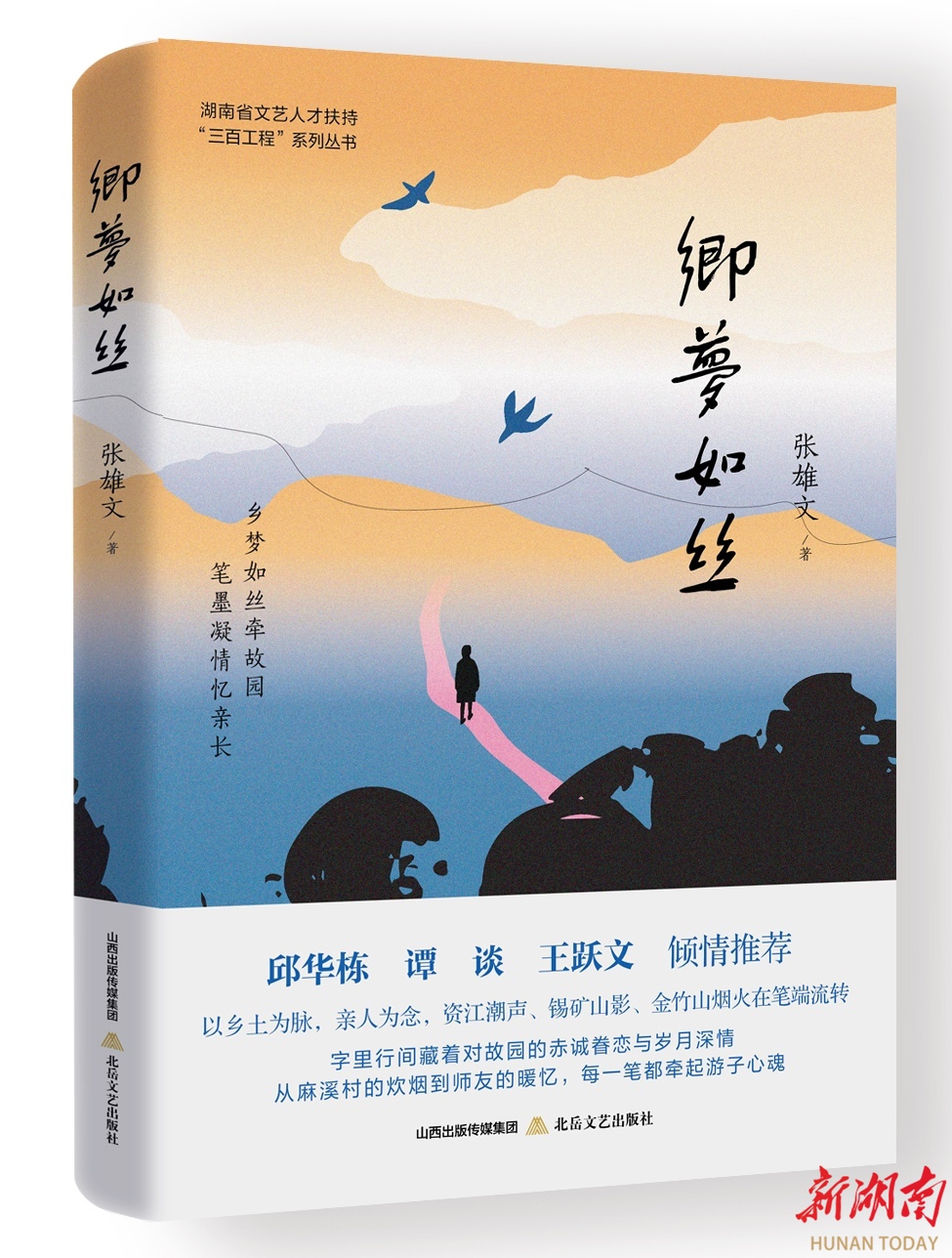 近日,張雄文新書《鄉(xiāng)夢如絲》由北岳文藝出版社正式出版發(fā)行。該書為作者最新散文集,系湖南省文藝人才扶持“三百工程”入選作品。全書凝眸老去的時光深處,以鄉(xiāng)土與親人為主線,或回望故園,或感懷雙親,或憶念師友。字里行間藏著對故園的赤誠眷戀與歲月深情。作者文風(fēng)或如山間小道素樸清新,或如萬頃汪洋浩瀚恣肆,筆力遒勁而老到,思慮沉郁而睿智。中國作協(xié)黨組成員、書記處書記、副主席邱華棟、中國作協(xié)原副主席譚談、中國作協(xié)主席團委員、湖南省作協(xié)原主席王躍文傾情推薦。譚談并撰寫序言,王躍文并題寫書名。