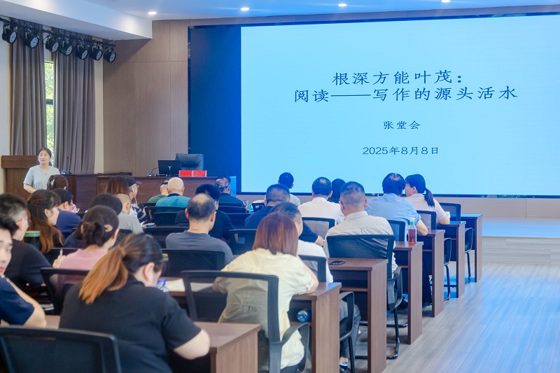 2025年8月8日下午,七十多名文學愛好者齊聚在揚州市江都區(qū)文體旅局會議室,聆聽了揚州大學文學院教授張?zhí)脮摹案罘侥苋~茂:閱讀—寫作的源頭活水”文學講座。