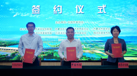 中國作協(xié)創(chuàng)聯(lián)部主任彭學明,內(nèi)蒙古文聯(lián)黨組成員、副主席閆艷,巴彥淖爾市委常委、臨河區(qū)委書記趙峻嶺簽署新時代文學實踐點三方合作協(xié)議。