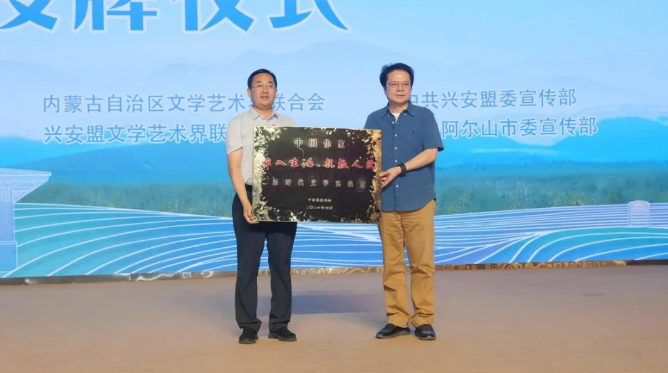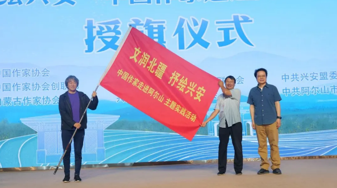 授牌儀式上,內(nèi)蒙古文聯(lián)黨組成員、副主席閆艷向阿爾山市委常委、宣傳部部長邰海峰頒授內(nèi)蒙古作家“深入生活、扎根人民”新時代文學實踐點牌匾;第十四屆全國政協(xié)常委、中國作協(xié)副主席、中國戲劇家協(xié)會副主席陳彥向興安盟行署副盟長、科右前旗委書記孫書濤頒授中國作家“深入生活、扎根人民”新時代文學實踐點牌匾,陳彥并向參加主題實踐活動的作家代表全勇先、王計兵授旗。