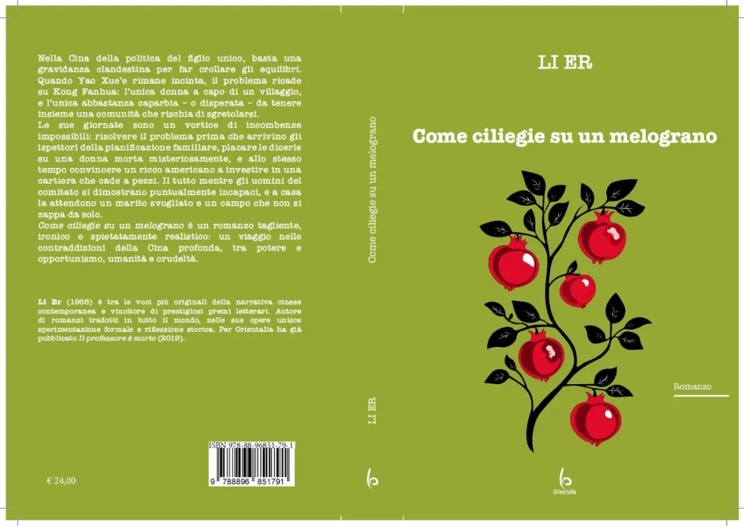 2025年《石榴樹上結(jié)櫻桃》意大利語版也問世。這次的封面采用了深綠色作為主色調(diào),給人一種自然、樸實、甚至帶點沉靜的感覺。它與石榴的紅色形成鮮明對比,同時也賦予了畫面一種有機的、泥土的氣息,與農(nóng)村背景相呼應。同時,畫面中心是一棵具有木刻版畫風格的石榴樹。木刻版畫在現(xiàn)代中國是一種非常重要的藝術(shù)形式,常被用于民間藝術(shù)、年畫和宣傳畫,甚至1930年代興起的木刻運動也成就了左翼美術(shù)運動的主要風格。[25]這些視覺構(gòu)圖傳達出農(nóng)村、左翼、民間等元素,并且呈現(xiàn)一種更具藝術(shù)性和經(jīng)典感的設(shè)計。雖然書名有“櫻桃” 兩字,但畫面上結(jié)的是紅色的石榴果實。這是一個非常有趣且關(guān)鍵的設(shè)計選擇。它似乎回避了英文版那種輕盈而荒誕的視覺構(gòu)圖,而是選擇了一種更為內(nèi)斂、象征性的表達。不過,跟英文版一樣,設(shè)計者在紅色石榴里面暗藏了嬰兒的圖案。整體而言,意文版的封面更像是一個藝術(shù)典藏品。