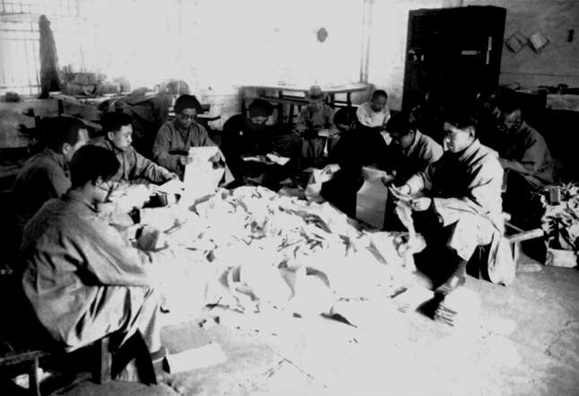 20世紀(jì)30年代初,故宮文獻(xiàn)館單士元(右二)、單士魁(右五)、王梅莊(右四)、律振聲(右六)等先生在內(nèi)閣大堂整理明清檔案。