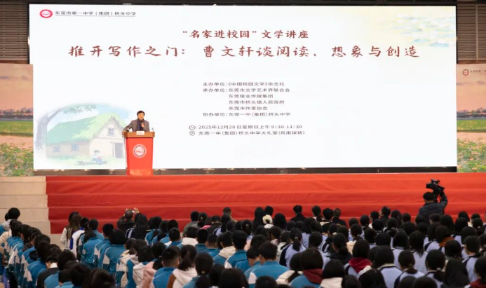 文學(xué)的未來(lái)在于青年,名家進(jìn)校園活動(dòng)同期舉辦。當(dāng)天上午,曹文軒走進(jìn)東莞一中(集團(tuán))橋頭中學(xué),以“推開(kāi)寫(xiě)作之門(mén):談閱讀、想象與創(chuàng)造”為主題,為師生們帶來(lái)一場(chǎng)啟迪心靈的講座。曹文軒結(jié)合《草房子》《根鳥(niǎo)》等經(jīng)典作品的創(chuàng)作經(jīng)歷,用生動(dòng)的語(yǔ)言深入剖析了閱讀積累、想象力培養(yǎng)與創(chuàng)作實(shí)踐的關(guān)系。他鼓勵(lì)同學(xué)們保持好奇心,從生活中發(fā)現(xiàn)美、感受情,勇敢地用文字表達(dá)自我?;?dòng)環(huán)節(jié),學(xué)生們圍繞寫(xiě)作困惑踴躍提問(wèn),曹文軒耐心解答,并寄語(yǔ)青少年“以閱讀為舟,以想象為帆,在文學(xué)海洋中勇敢航行”。