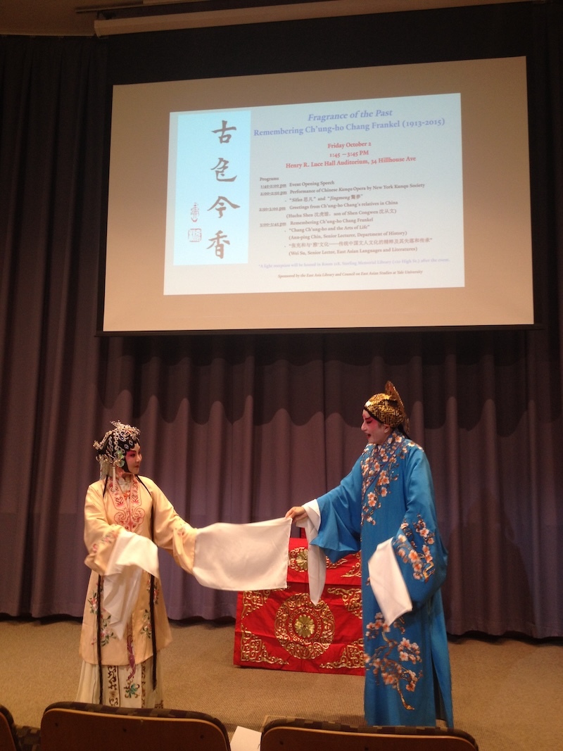 追思會上,先生親友懷念之辭深切感人。沈從文先生的兒子沈虎雛(母親張兆和是張充和三姐)專程從中國前往耶魯參加紀(jì)念活動。紐約昆曲社演出的“思凡”和“驚夢”兩出折子戲極為成功。我至今還能記得有一位先生學(xué)生的發(fā)言提到一個細(xì)節(jié),充和先生不僅教授昆曲,還曾自制演出服飾。耶魯歷史系金安平(Annping Chin)女士出版過《合肥四姐妹》(張氏四姐妹祖籍合肥)一書,她發(fā)言的題目是“張充和的藝術(shù)人生”。耶魯東亞語言文學(xué)系蘇煒先生談“張充和與‘雅’文化——傳統(tǒng)中國文人文化的精粹及其失落和傳承”。追思會后,在圖書館東亞部有個小型的招待會,我隨美術(shù)館亞洲部主任江文葦(David Sensabaugh)先生一起前往,觀瞻了充和先生的墨跡和相關(guān)書籍。耶魯“東亞圖書館”牌匾即為充和先生所書。
