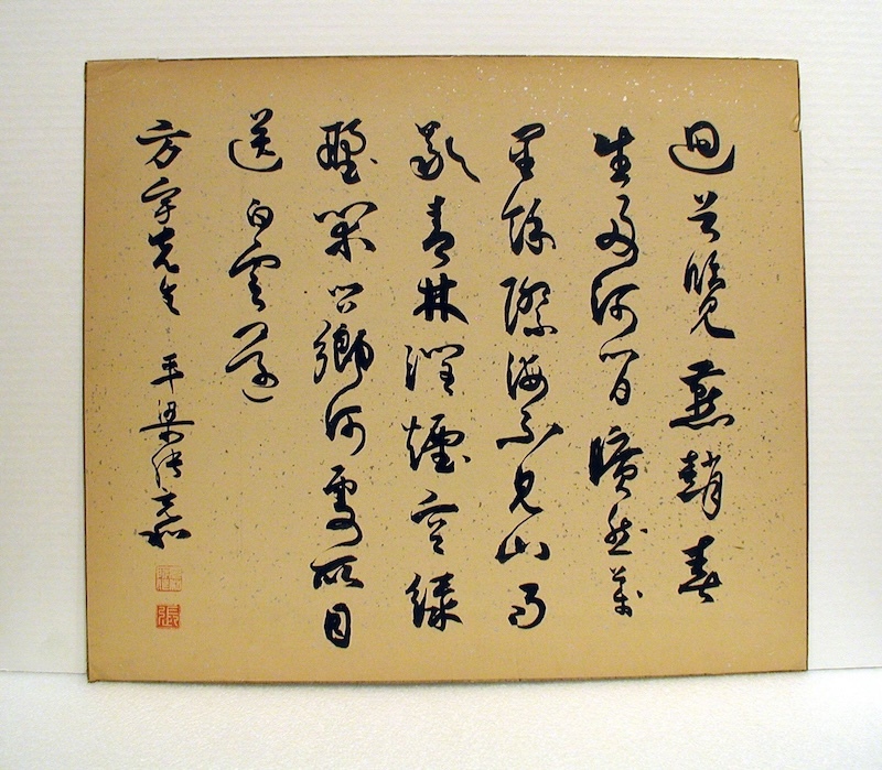 我在耶魯美術(shù)館訪學(xué)期間,主要負(fù)責(zé)整理館藏中國書畫資料。在美術(shù)館的收藏中,有兩件充和先生的書法作品。一件是她本人于1993年捐贈之物,尺寸為36 x 41 cm,已裝框,從右至左用篆書、楷書、行書和草書四種書體書寫“尋云相伴歸”五字,沒有簽名和印章,看來似乎是一件為學(xué)生示范的作品?!皩ぴ葡喟闅w”源自北宋王安石五言絕句《山中》,全詩為“隨月出山去,尋云相伴歸。春晨花上露,芳?xì)庵艘?。”全詩營造出超脫塵俗和清新幽遠(yuǎn)的意境。作品書法追尋古意,特別是楷書“尋”字橫畫的收筆和“云”字下面撇折斷開的寫法,無不流露出魏晉書風(fēng)的意蘊(yùn)。另一件是王方宇夫婦捐贈的作品,約寫于1960年代。這件尺寸為36 x 42cm,用濃墨寫在灑金箋上,神采非凡。字體為小草,寫的是唐代崔湜的五言律詩《冀北春望》:“回首覽燕趙,春生兩河間。曠然萬里余,際海不見山。雨歇青林潤,煙空綠野閑。問鄉(xiāng)何處所,目送白云還?!焙笫穑骸胺接钕壬?,平梁張充和?!毕旅驸j印兩方,“充和所作”及“張”。充和先生在和她弟弟張宗和的通信中,談到唐代孫過庭《書譜》,還談到日日臨習(xí)賀知章《孝經(jīng)》(參看《一曲微?!浜妥诤驼勊囦洝罚?。她的這件小草書,能感受到晉唐書法的風(fēng)骨,筆勢連綿又顯得典雅勻停,有些字有章草的意韻,如“逥”字和“送”字的“辶”旁捺畫都向上收筆,是章草的寫法。