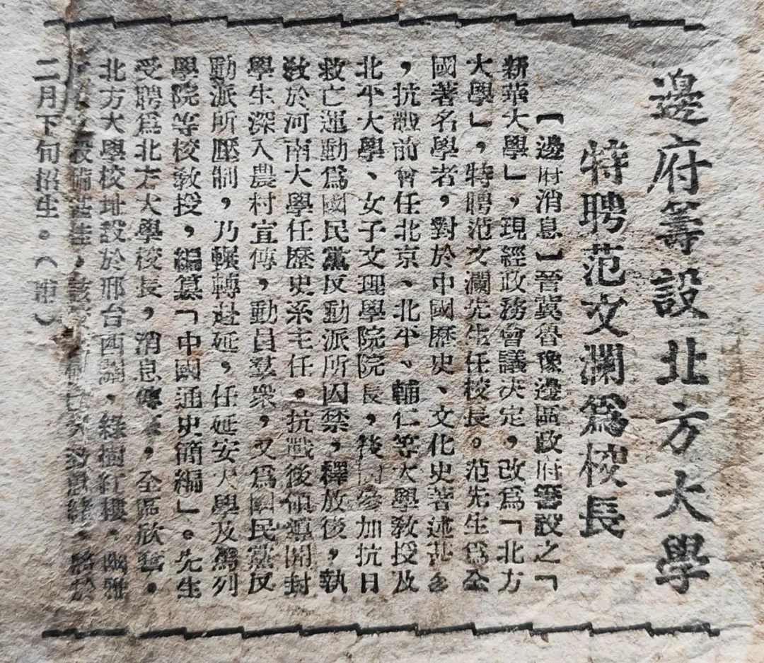 1945年,抗戰(zhàn)取得偉大勝利,和平曙光初現(xiàn)。面對(duì)解放區(qū)各項(xiàng)建設(shè)事業(yè)對(duì)人才的急迫需求,黨中央決定在晉冀魯豫邊區(qū)創(chuàng)辦北方大學(xué),設(shè)文教、財(cái)經(jīng)、工、農(nóng)、醫(yī)、藝術(shù)、行政等七個(gè)學(xué)院和財(cái)經(jīng)、歷史兩個(gè)研究室。1946年1月5日,北方大學(xué)在河北邢臺(tái)正式成立,成為抗日戰(zhàn)爭(zhēng)勝利后中國(guó)共產(chǎn)黨創(chuàng)辦的第一所學(xué)科齊全的綜合性大學(xué)。