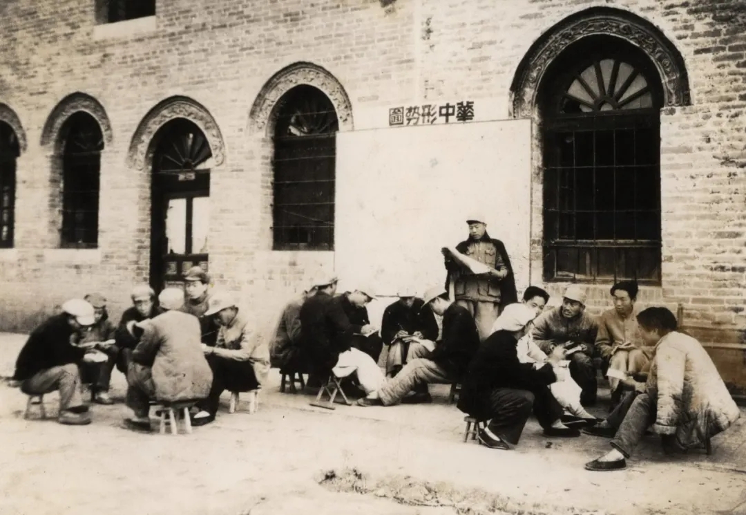 北方大學(xué)文教學(xué)院的學(xué)員在室外讀報(bào)