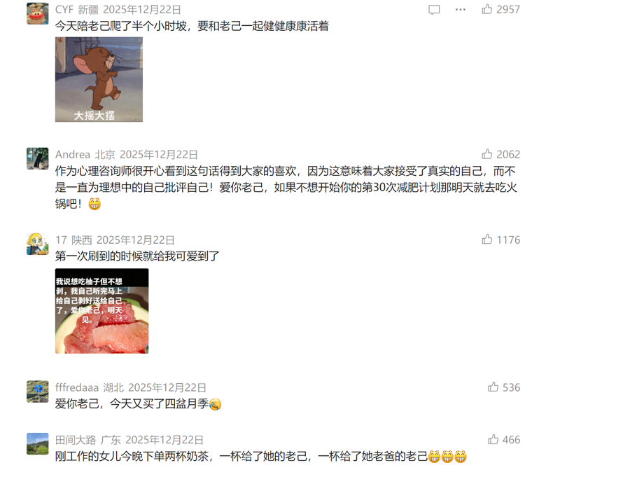 年末“老己”大火,從“第一杯敬自己”到“愛你老己天天見”再到“老來得己”,熱梗的變化足夠證明,從對(duì)廣闊世界的關(guān)注回收到“自己”,喝杯水、爬個(gè)坡、剝個(gè)柚子,用小事把自己養(yǎng)好,就是最好的成就。