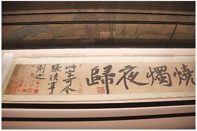“元祐風華”展區(qū)是整場展覽的高光。這里復刻了北宋“西園雅集”的風雅場景,宋五大名窯的瓷器、古樸的青銅彝器、玲瓏玉琴錯落陳列,仿佛能聽見當年蘇軾、黃庭堅、米芾等名士詩文唱和的歡聲笑語。核心展品草書《浣花溪圖引》卷作為黃庭堅現(xiàn)存最早的草書作品,結字中宮緊湊,筆勢縱逸灑脫,筆法多骨少肉,可窺見其晚年草書的某些特征?!包S庭堅是宋代書法頂級大師,其書法思想成熟深刻,大字行楷書獨樹一幟,這是他位列宋四家之一的重要原因?!秉S庭堅詩書畫院院長、書法家黃君說。