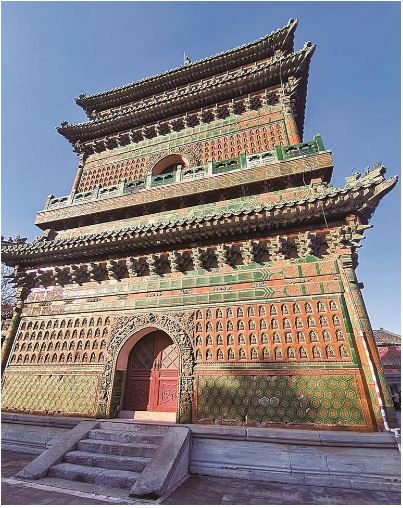 記者看到,琉璃閣以黃綠為主色調(diào),有二層,上層為重檐歇山頂,上下層皆為綠琉璃瓦頂。資料顯示,琉璃閣立面上鑲嵌著1424尊無量壽佛琉璃像,是全國少見的清代官式琉璃建筑。院落中的七佛塔亭內(nèi),八角石塔上刻著七世佛和乾隆御筆所書《七佛塔碑記》,全國僅此一例,展現(xiàn)了中國古代建筑的高超技藝與工程智慧。記者注意到,琉璃閣一層的佛像頭在歷史上遭到損毀,二層則保留較為完整,尤其是琉璃拱門周邊裝飾的大鵬鳥等藏傳佛教中的裝飾,姿態(tài)和神情都清晰可見。七佛塔亭為重檐八角形,隔著玻璃向里看,能隱約看到一座高大的八角形石塔。