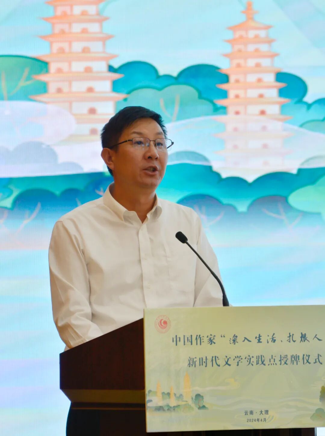 2024年4月23日下午,中國(guó)作家“深入生活、扎根人民”新時(shí)代文學(xué)實(shí)踐點(diǎn)授牌儀式在大理舉行。中國(guó)作家協(xié)會(huì)創(chuàng)聯(lián)部副主任包宏烈,云南省文聯(lián)副主席、秘書長(zhǎng)晏中,中共大理州委常委、州委秘書長(zhǎng)楊瑜出席授牌儀式。大理州人民政府黨組成員、秘書長(zhǎng)周武軍主持授牌儀式。