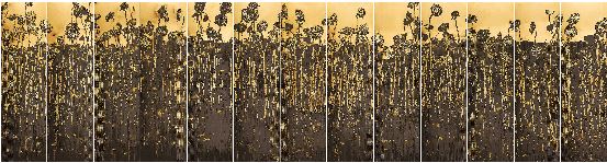 寧波美術(shù)館位于由甬江、姚江、奉化江匯聚而成的“三江口”北側(cè),200年來,這里都是一代代寧波人往來奔波的航運(yùn)樞紐。因此,美術(shù)館完全按照當(dāng)年候船大廳的尺寸進(jìn)行了重建,使得美術(shù)館的內(nèi)部空間極其高大,8米高的展墻有的用整面鋼鐵鑄就,有著極強(qiáng)的金屬質(zhì)感,能很好地烘托出“大作品”的雄渾氣勢,形成內(nèi)在的強(qiáng)烈呼應(yīng)。比如,此次展出的作品《共生會否可能》,就是最受觀眾歡迎的一個“打卡點(diǎn)”。這個裝置作品由1600根6米多高的金屬葵頭與蓮蓬頭組成,自2009年完成主體制作以來,已在北京的國博序廳、上海中華藝術(shù)宮的穹頂藝術(shù)中心、浙江美術(shù)館,以及德國德累斯頓市的博物館、萊茵河與摩澤爾河交匯的“德意志之角”等地展出。每次展出,不同的展呈形式都為這件作品賦予了新的生命與內(nèi)涵。此次展出,我以影像與音響為之構(gòu)建了一個共同的多重感知的藝術(shù)現(xiàn)場。展廳里,紅色的燈光打在這片“葵山”上,讓它既像濃霧中的一個巨大熔爐,又像一片著火的荒原,林立的銅葵與展廳立面三個巨屏里的活動影像以及鏗鏘作響的“鍛葵”的聲音交織在一起,展現(xiàn)了生命灼灼其華的生長與消逝,又似在這片葵園的濃霧中點(diǎn)燃了共生的渴望與某種偉大的遐想。還有“燎原”板塊展出的葵園油畫,它們一部分如長卷一樣大片橫呈在空間當(dāng)中,仰看四周廳壁,則是懸掛至5米高處的3米“大畫”,十分震撼。換一角度,從廳內(nèi)的復(fù)式二層向下看,這片“葵地”又好像正在無盡地生長,俯仰之間頗有種仰觀天地宇宙之大、俯察品類之盛,看萬物生長、爐火燎原的一派充滿生機(jī)的野性之美。