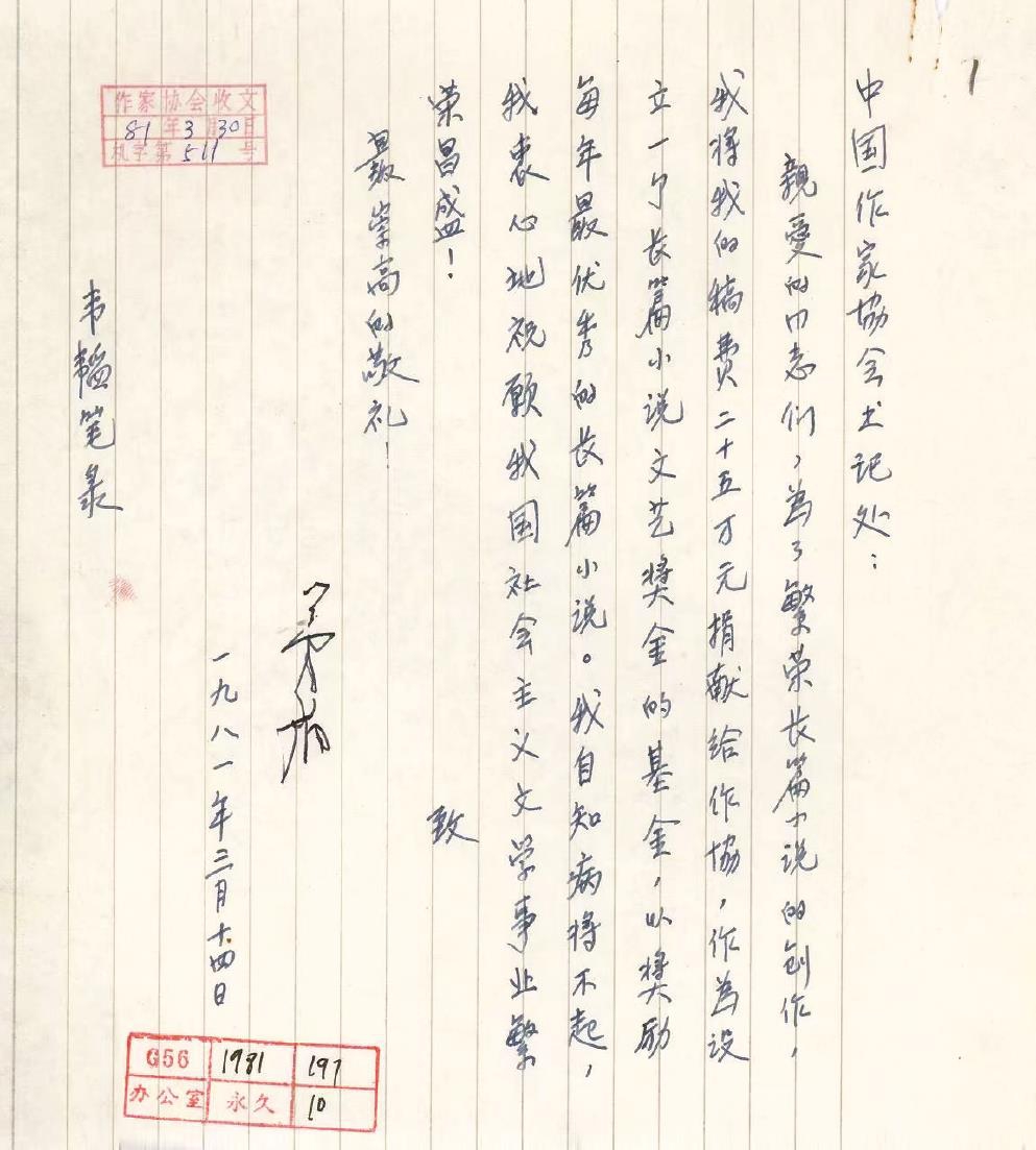 茅盾逝世前致中國作協(xié)的信