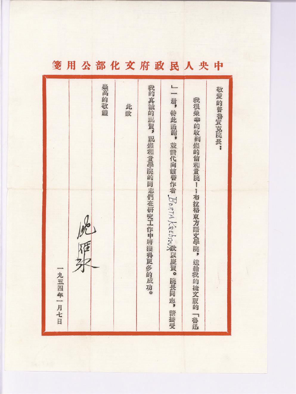 茅盾致普實(shí)克的公函 中國現(xiàn)代文學(xué)館藏
