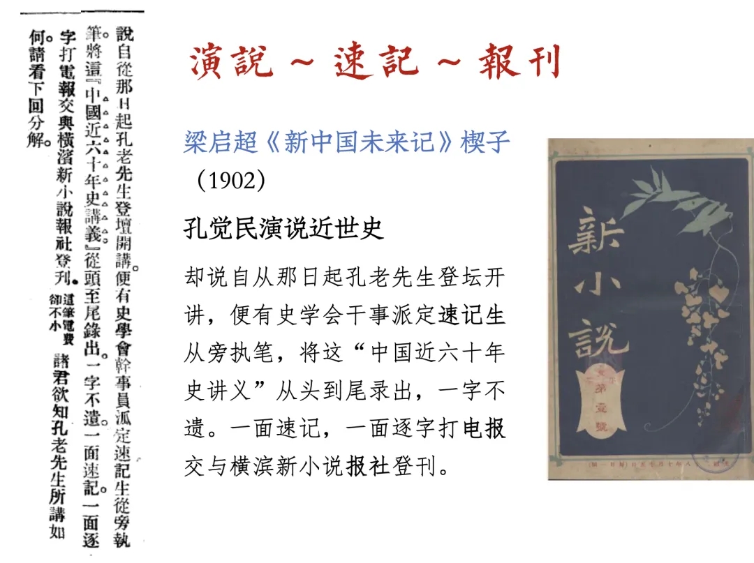 1902年梁?jiǎn)⒊凇缎滦≌f》創(chuàng)刊號(hào)上發(fā)表《新中國未來記》,速記作為演說的配角悄然登上歷史舞臺(tái)。小說第一回設(shè)置的場(chǎng)景是維新五十周年慶典,在上海召開大博覽會(huì),“處處有演說壇,日日開講論會(huì)”。博覽會(huì)場(chǎng)中央是京師大學(xué)校文學(xué)科史學(xué)部舉辦的講座,邀請(qǐng)全國教育會(huì)會(huì)長(zhǎng)孔覺民演說“中國近六十年史”: