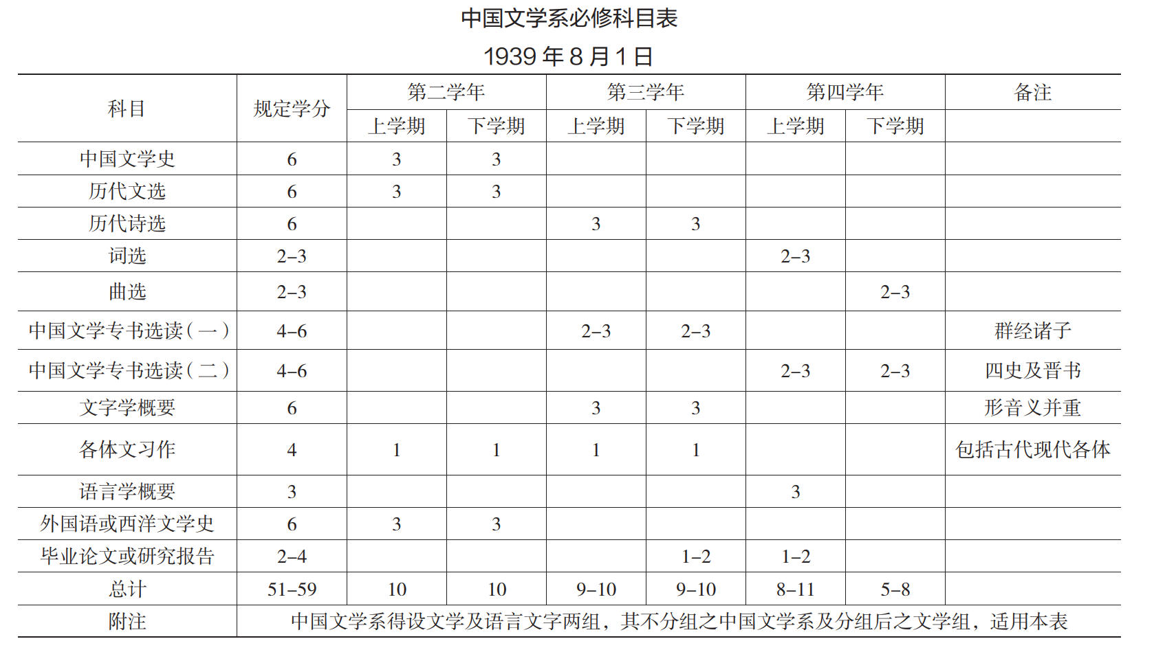 課程制定是學(xué)科教育的重要環(huán)節(jié),關(guān)乎教學(xué)的質(zhì)量和成敗。何為必修?何為選修?都需要經(jīng)過學(xué)理的探討和科學(xué)的考量。1938年,中文系課程草案由朱自清和羅常培擬定,再由教育部送請各校專家學(xué)者簽署意見,根據(jù)大學(xué)課程會議的討論結(jié)果,教育部頒布了中國文學(xué)系必修、選修科目表。