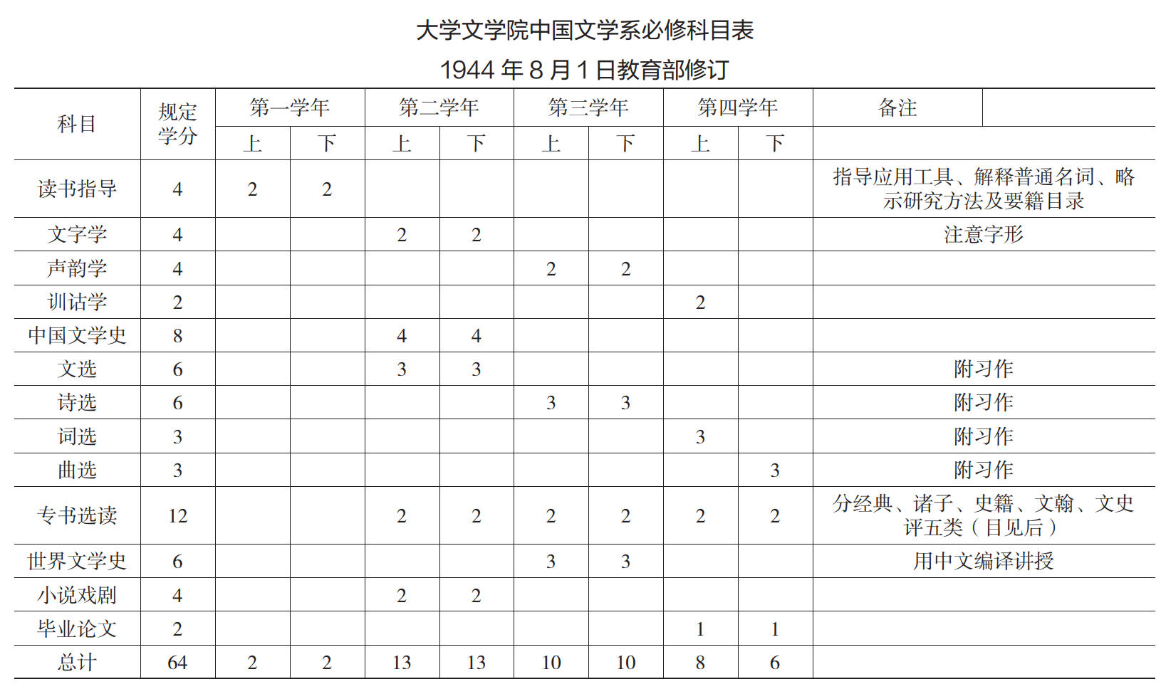 各院系科目表的制定對大學(xué)教學(xué)和研究關(guān)系重大,圍繞中文系科目表的論爭也旨在完善中文教育課程制度,但課表頒布之際,正值抗戰(zhàn)軍興,各院校紛紛內(nèi)遷,教學(xué)秩序混亂,教育部的課程規(guī)劃更難執(zhí)行,許多學(xué)校因地制宜,結(jié)合當(dāng)前辦學(xué)條件,自行修訂課程表。待大后方穩(wěn)定下來后,教育部根據(jù)各地院校的教學(xué)實(shí)踐,再次修訂大學(xué)課程表。